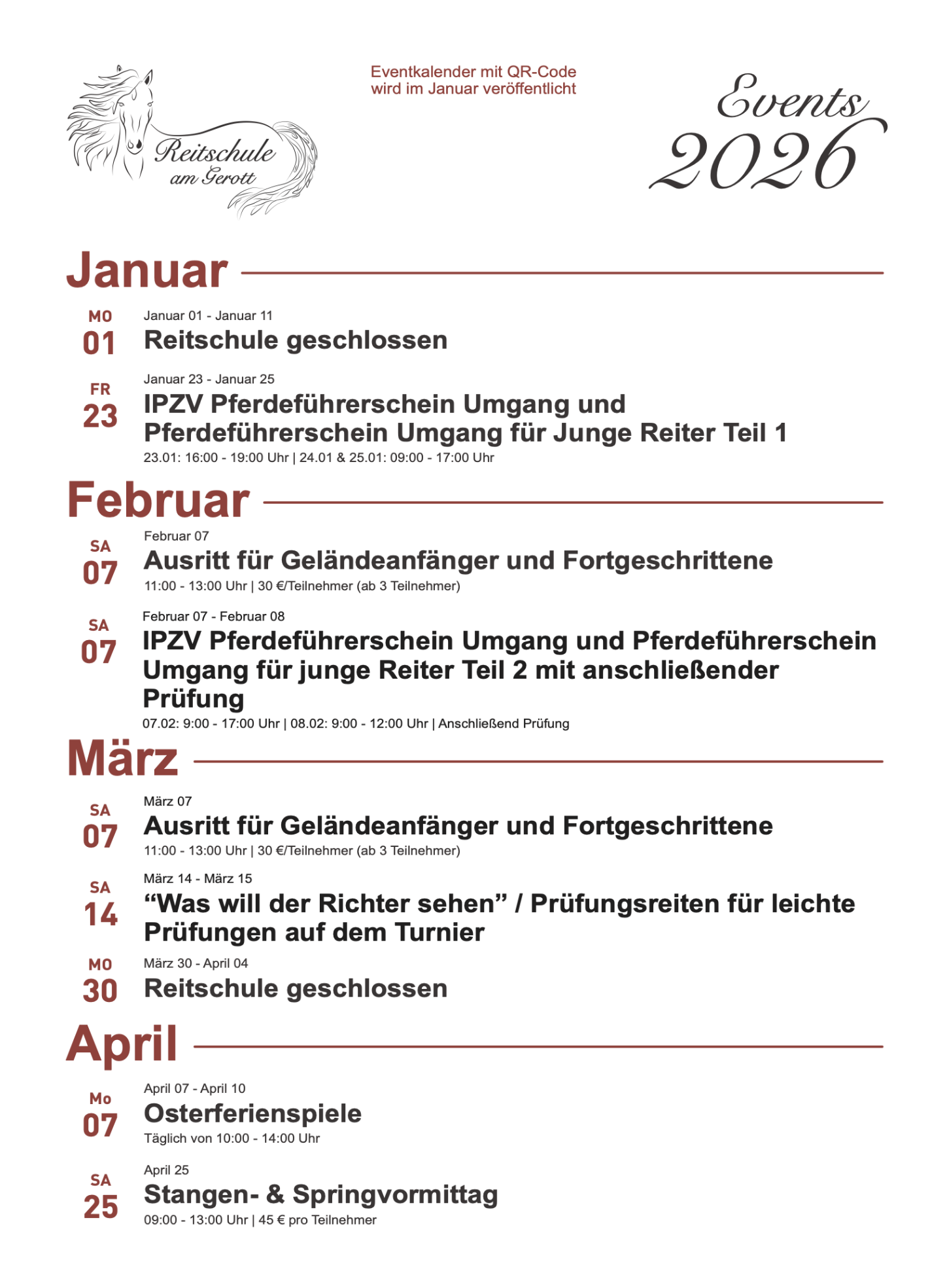 Wir stellen dir die beliebtesten Events vor – von Ausritten bis zu Ferienprogrammen. Jedes Event hat eine eigene Detailseite mit Anmeldung, Preis und Kalender-Link.